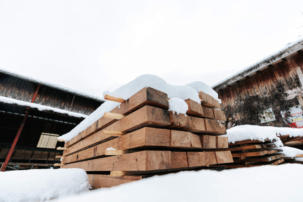 Stock de planches de bois sous la neige